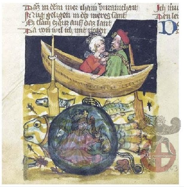 Μεσαιωνικό σχέδιο από την Δύση, που δεικνύει τη εξερεύνηση του Μ.Αλεξάνδρου στον βυθό της θάλασσας .