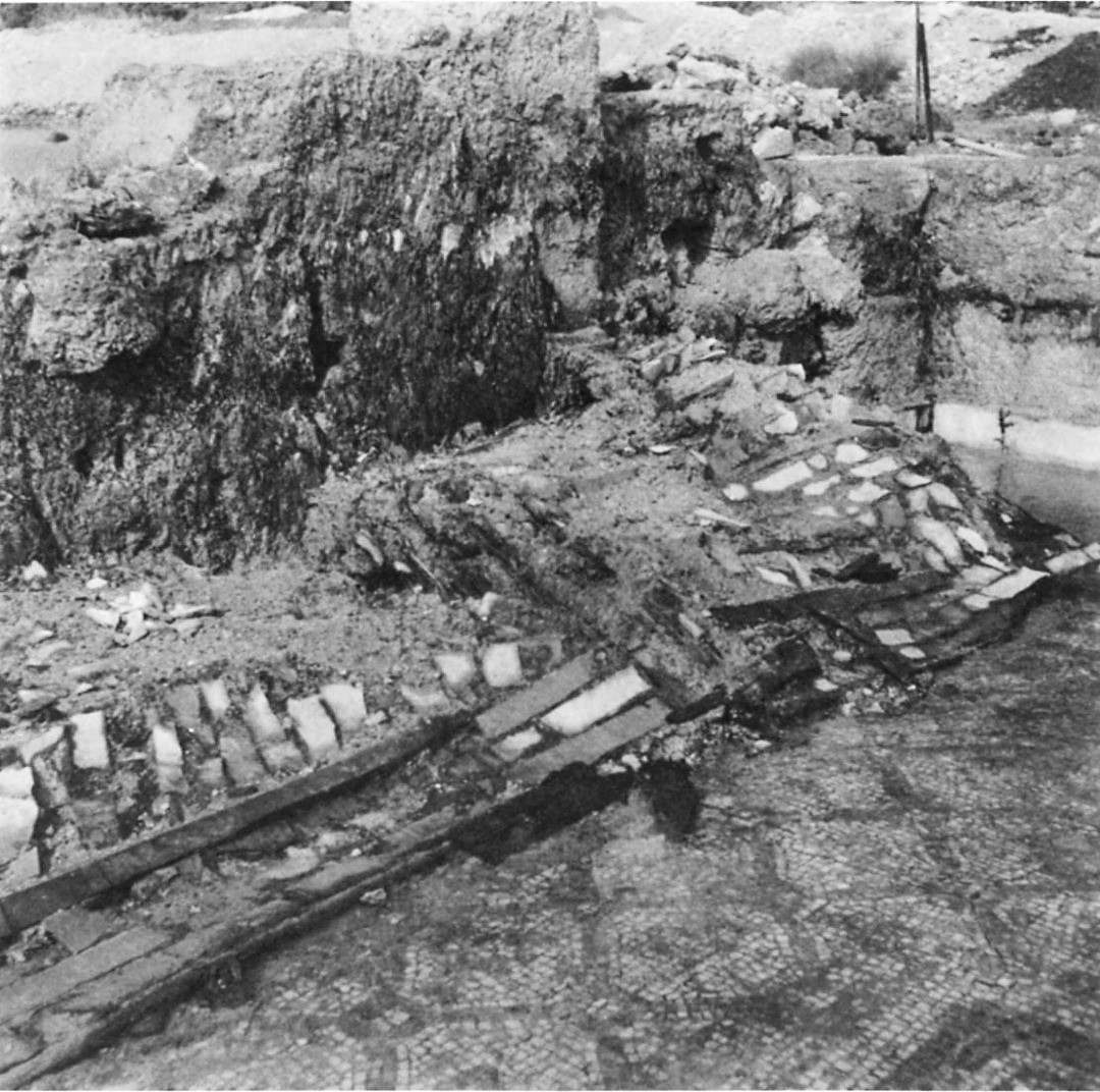 Εικόνα 5: Συστάδα συσκευασμένων υαλοθετημάτων στηριγμένη στον βόρειο τοίχο του αψιδωτού κτιρίου, όπως αποκαλύφθηκε κατά τις ανασκαφές των ετών 1965 – 1966. (Πηγή φωτογραφίας: σύγγραμμα βιβλιογραφίας α/α 8, plate 39a).