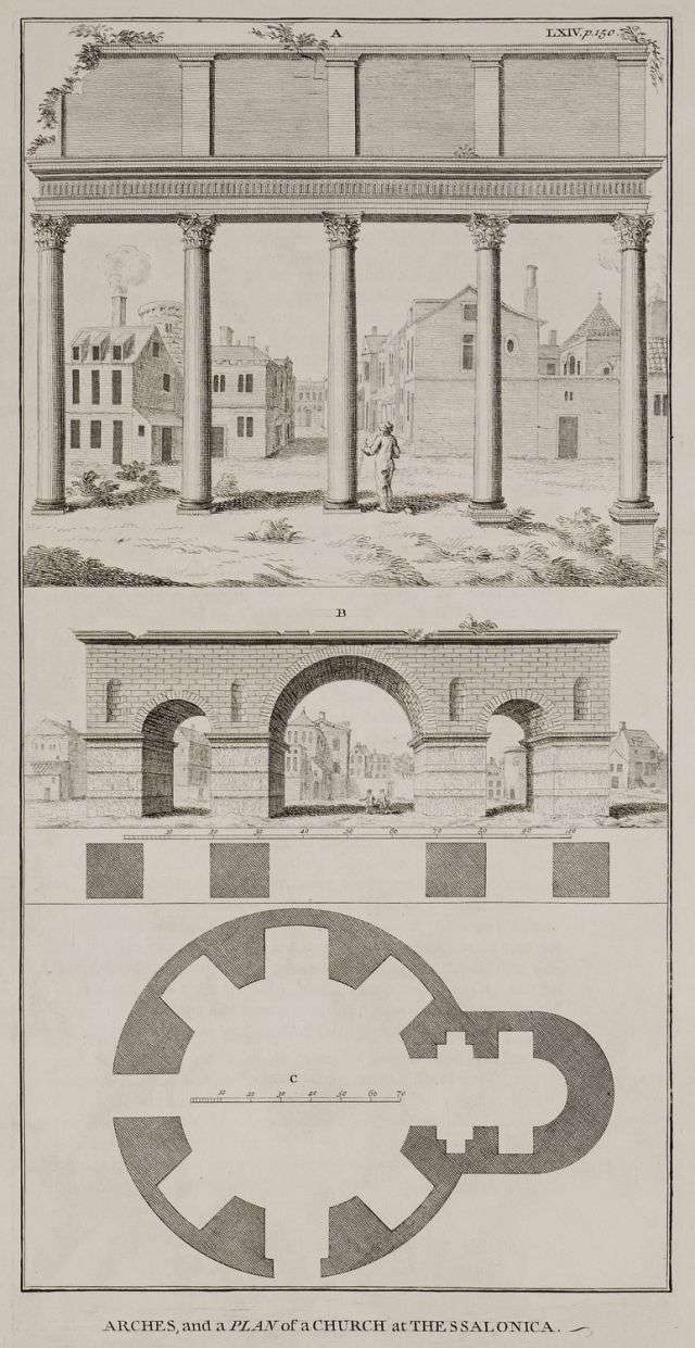 Άποψη των γλυπτών της νότιας εισόδου της Ρωμαϊκής εποχής Αγοράς της Θεσσαλονίκης (Στοά των Ειδώλων -Incantadas ή Μαγεμένες). Άποψη και κάτοψη της θριαμβικής αψίδας του Γαλέριου (Καμάρας). Κάτοψη της Ροτόντας. 1745