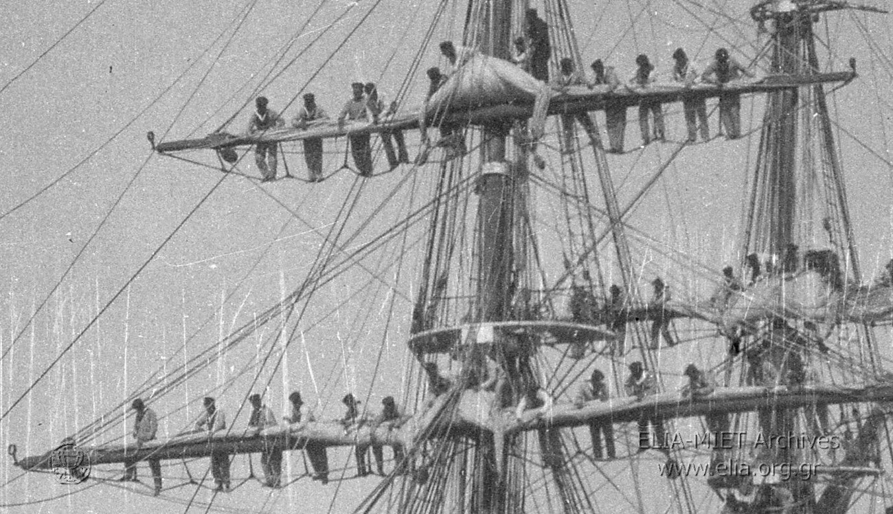 Η πλώρη του Άρη με την Αθηνά στο ακρόπρωρο και ναυτόπαιδες στα ξάρτια και τα κατάρτια. Ναύσταθμος Πόρου, 1905. (ΦΑ 04.16.2.074 -λεπτομέρεια)